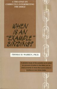 I draw upon Thomas B. Warren’s When is an ‘Example’ Binding? as a classic example. Warren was a great and classic polemicist in the last half of the 20th century. He challenged atheists like Anthony Flew as well as those within his own circle of fellowship. When is an ‘Example’ Binding? was first published in 1975 and remains a critical textbook among many today. My first encounter with the book was in a class called “Establishing Biblical Authority” with Kippy Myers, now a professor at Freed Hardeman University. When is an ‘Example’ is a difficult book to read at best but if we get beyond Warren’s writing style it is fascinating in its claims.
