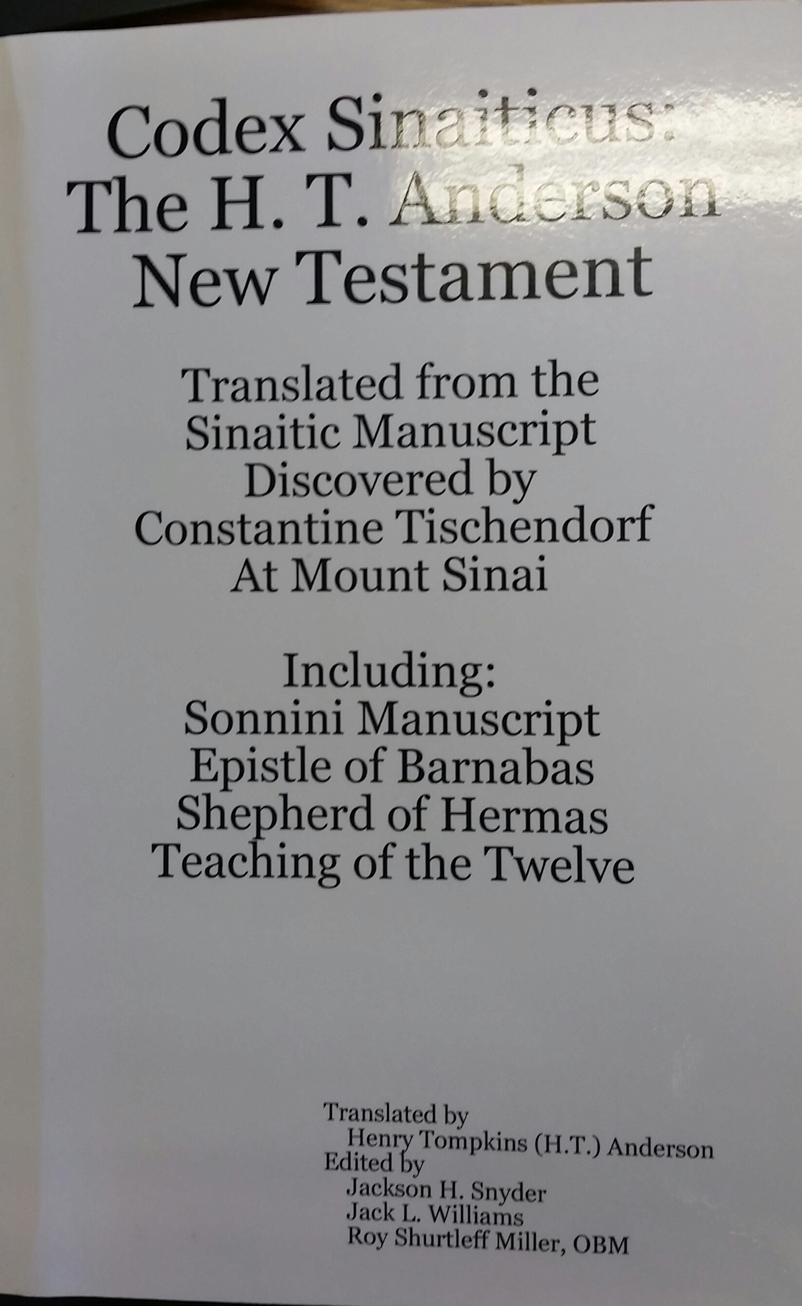 Contemporary Reprint of H. T. Anderson’s translation of Codex Sinaiticus. It included The Didache, The Shepherd of Hermas and Epistle of Barnabas