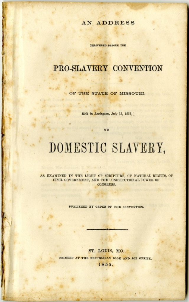 Against the backdrop of the “Bleeding of Kansas” (where the Civil War began long before Ft. Sumter) he addressed the Missouri Pro-Slavery Convention in 1855. His An Address … On Domestic Slavery amounted to a declaration of war on abolitionists for trying to “steal our property.”