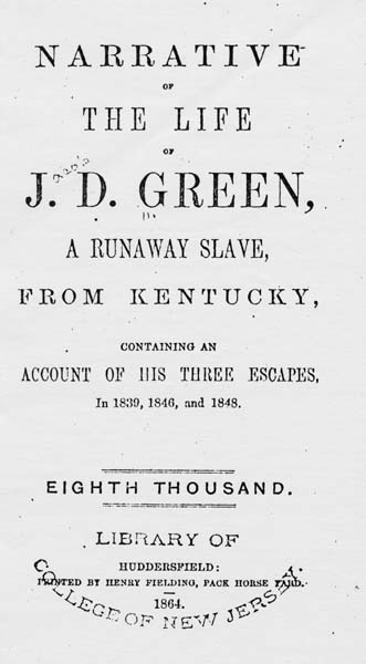 Green would publish a narrative called The Narrative of J. D. Green, a Runaway Slave, from Kentucky, Containing An Account of his Three Escapes in 1839, 1846 and 1848. It is a fascinating and harrowing at the same time. Green proves to be creative at besting slavery and surviving.